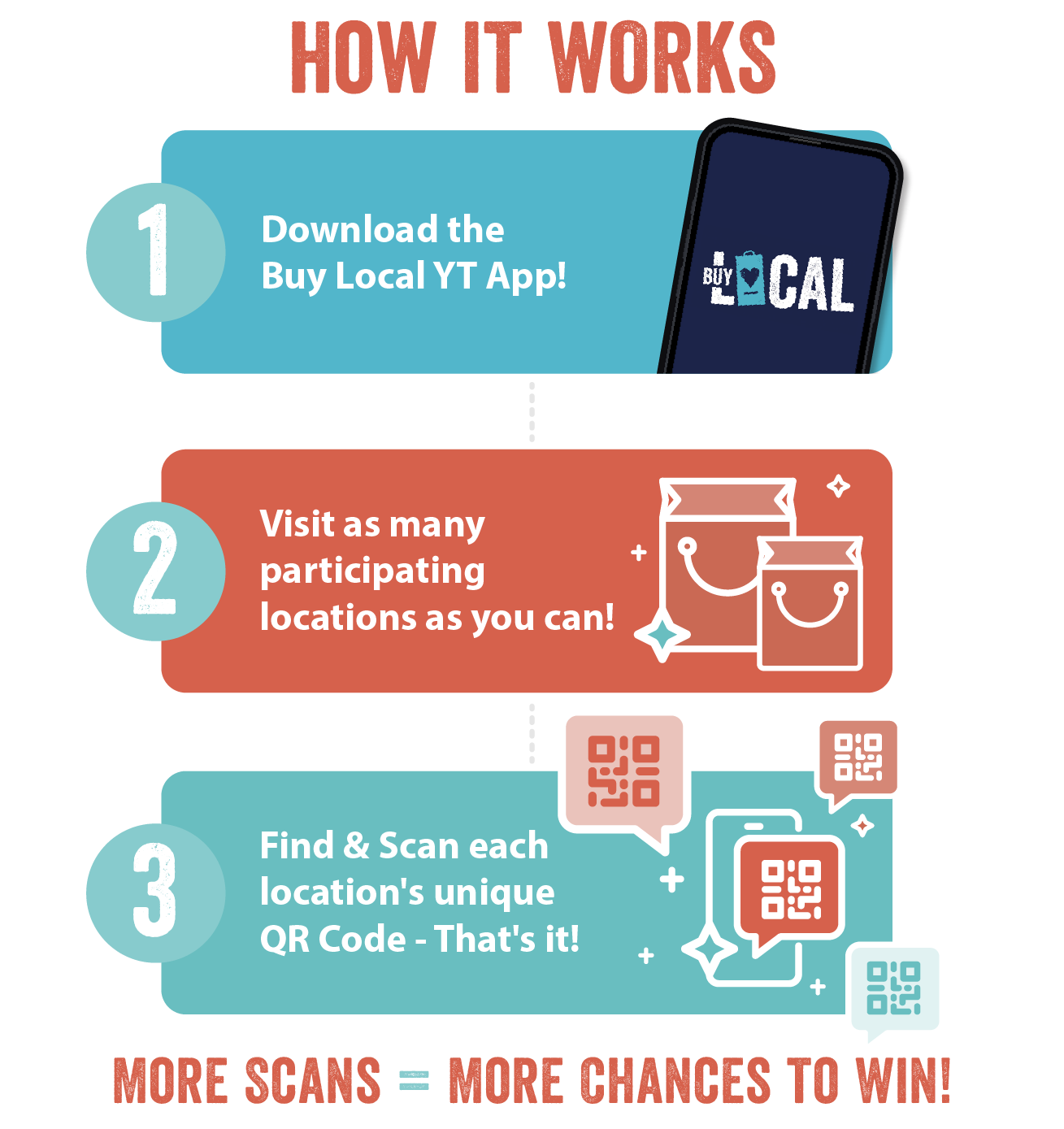 Make sure you download and use the Buy Local YT App during Yukoner Appreciation Week - October 23, 24 & 25, to scan as many QR codes as you can for your chance to win. Each participating location with a QR code is listed in the app, so download the app in advance, plan your route and visit them all!